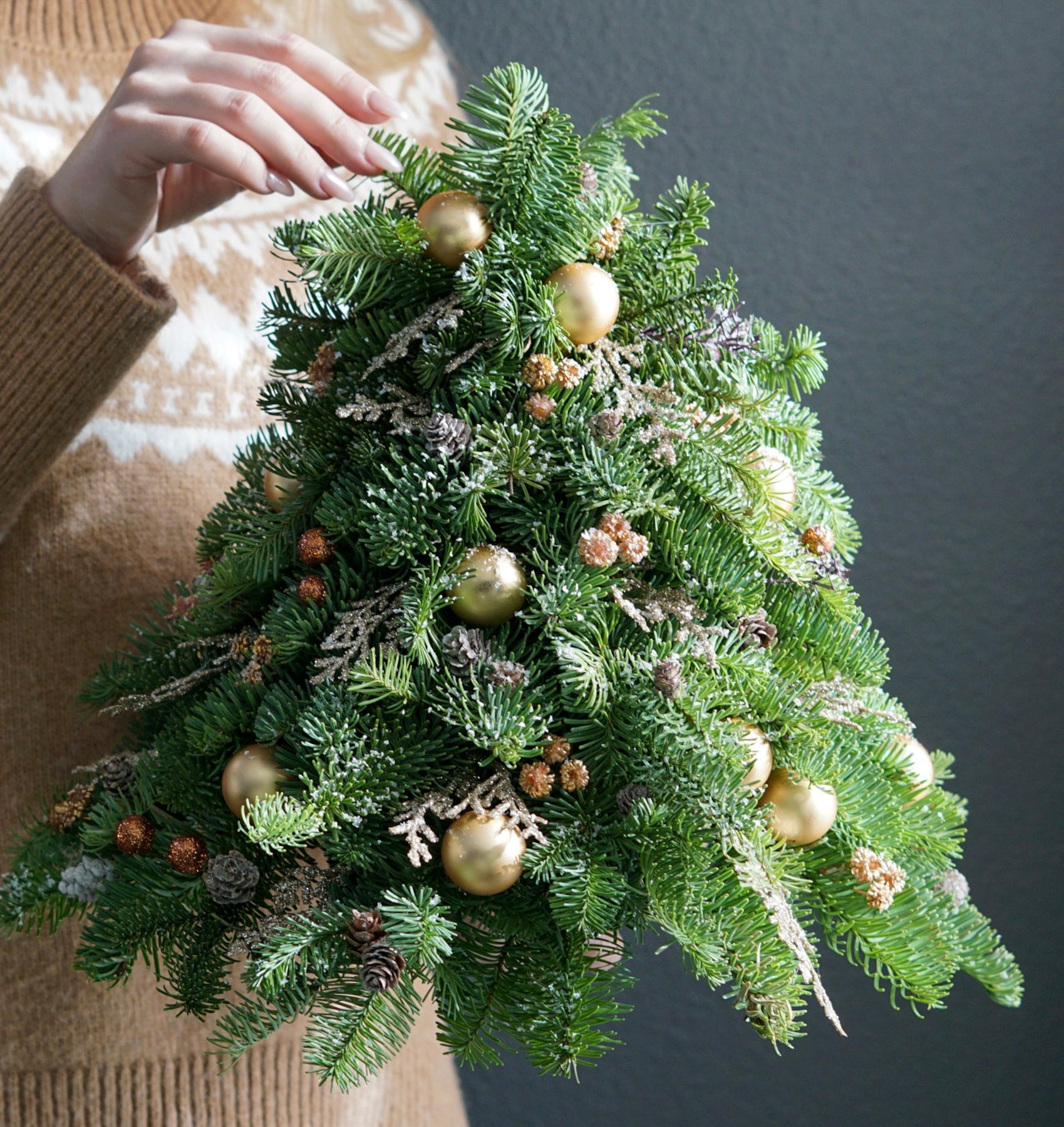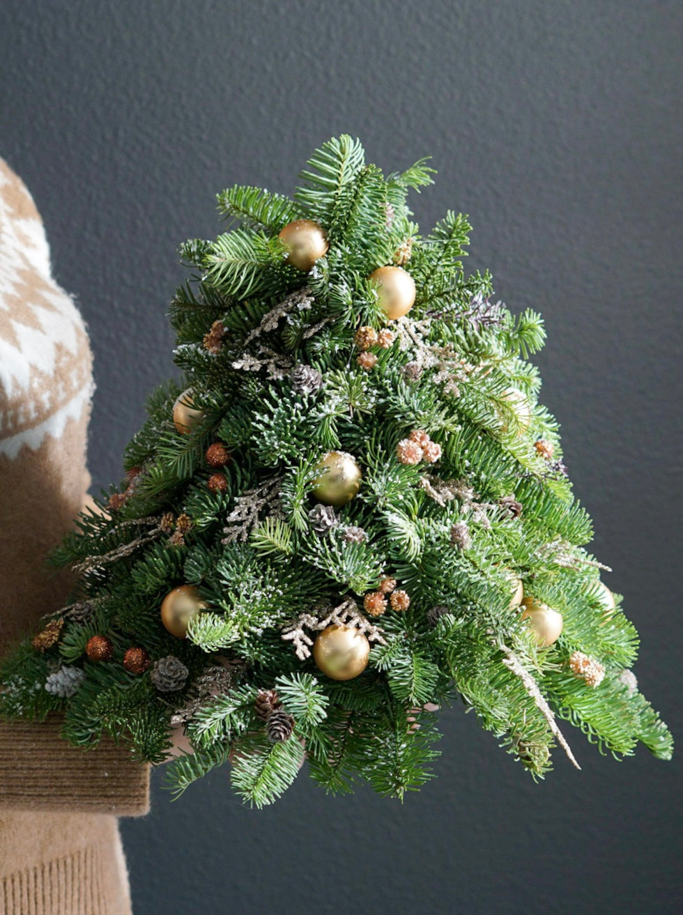 This festive handmade “Christmas tree” arrangement is crafted from fresh noble greenery, lasts about 3 to 4 weeks, doesn’t shed, and stays cute even when it dries. It smells amazing, just like a fresh Christmas tree. Made by hand, it includes ornaments and a little bit of our love.