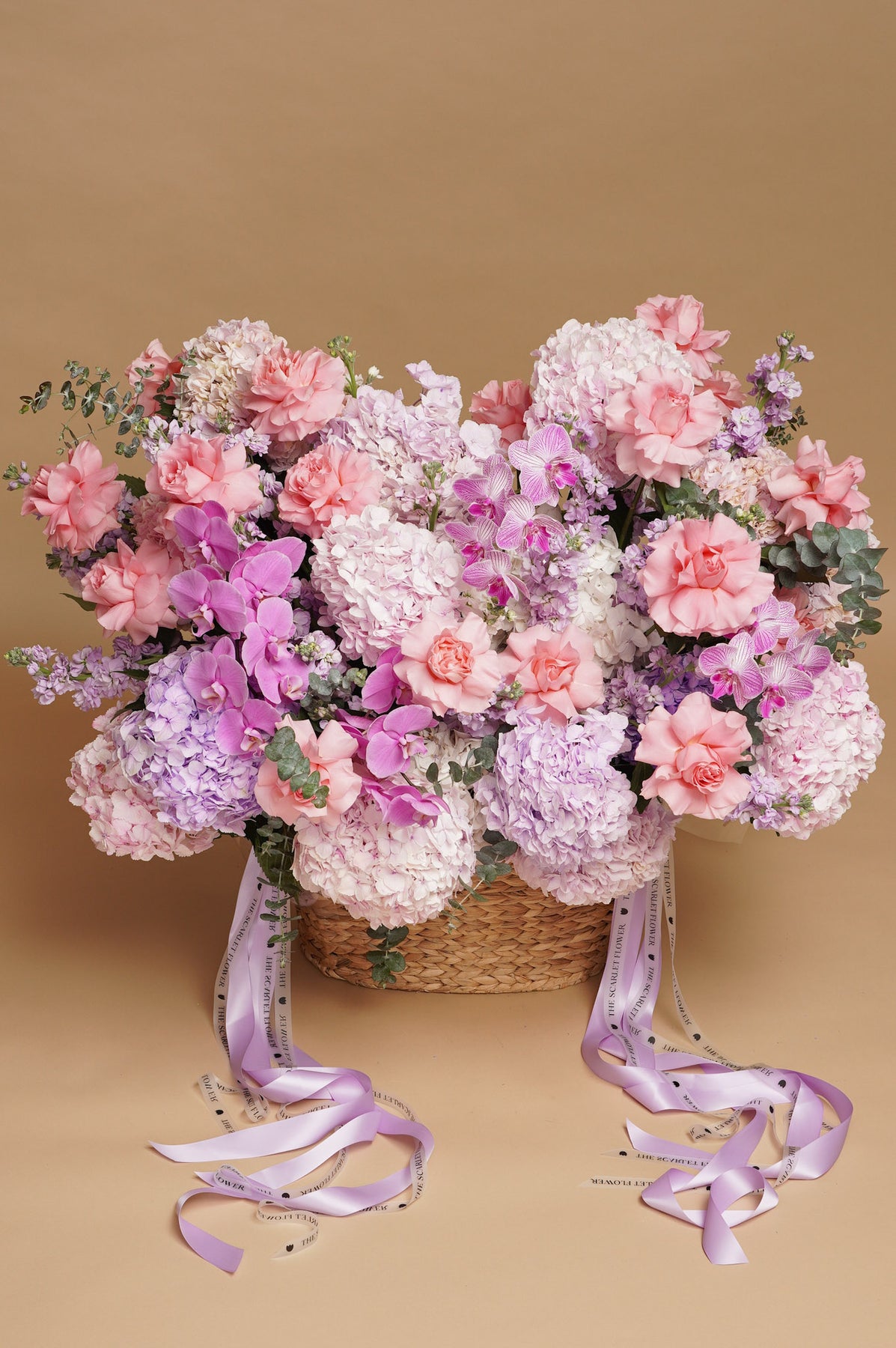 Oversized, cloud like arrangement featuring hydrangeas, orchids, French roses, stock, and eucalyptus, soft, airy, and dreamy.