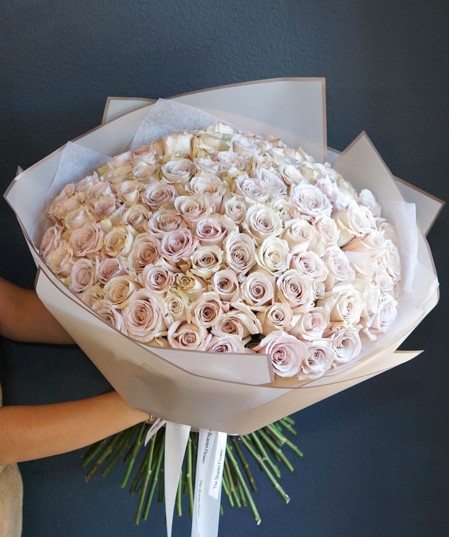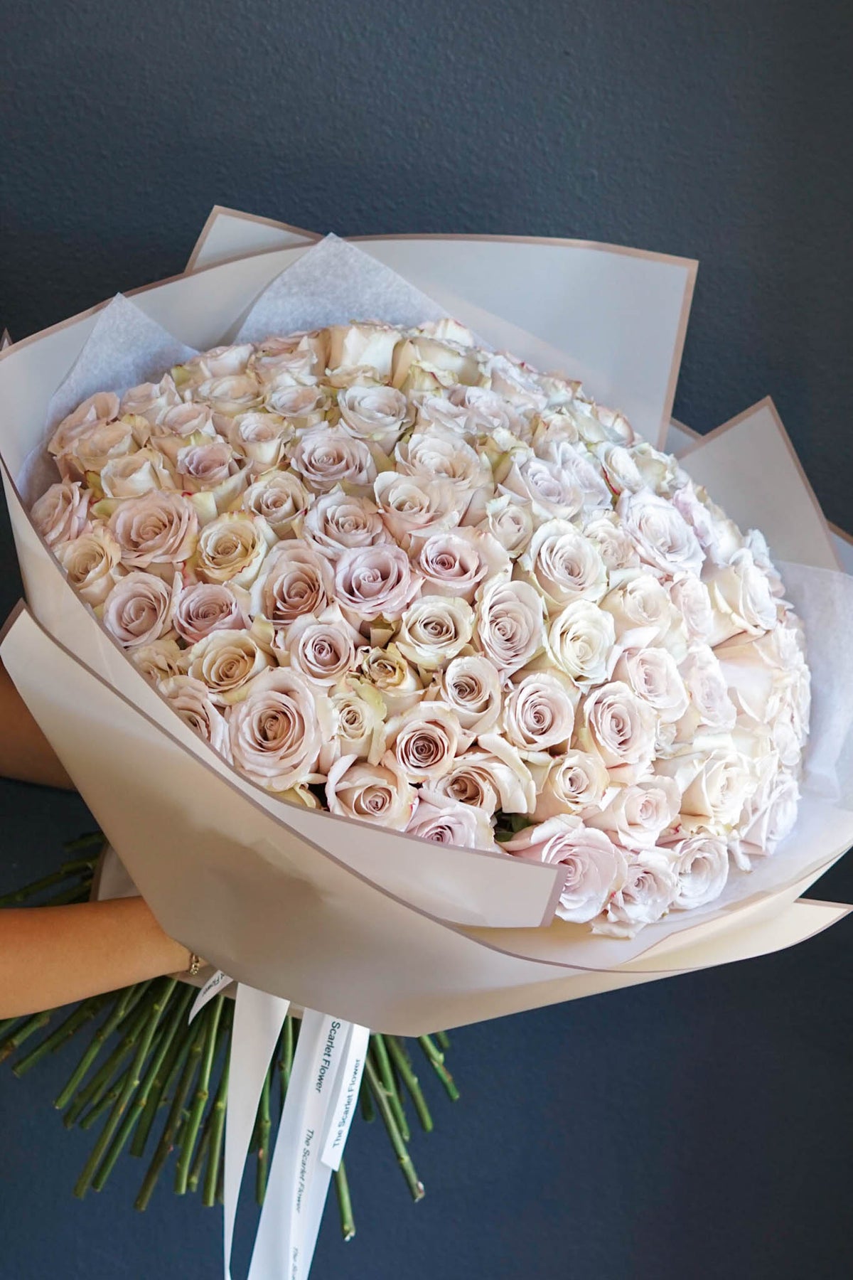 If a dozen roses get you 12 kisses, guess how many kisses this bouquet of 100 roses will get you!  Made with ivory long stem Quicksand roses and as always, our love. Perfect for romantic occasions.