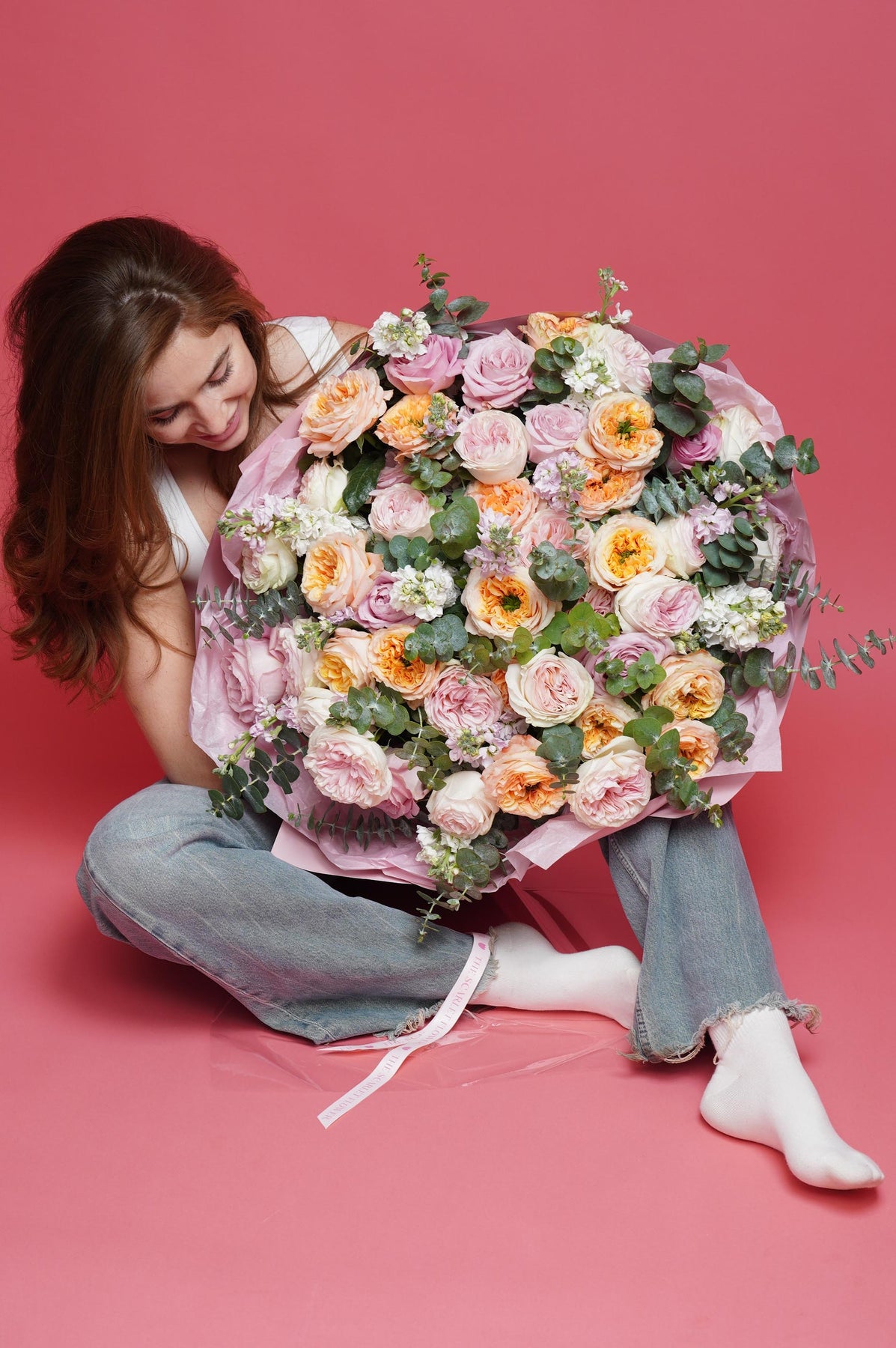 Lush garden rose bouquet in peach and blush tones with eucalyptus, romantic and elegant style. Perfect for Valentine’s Day, anniversaries, birthdays, romantic surprises, celebrations, thank you gifts, Mother’s Day, get well wishes, and luxury flower delivery for any special occasion.