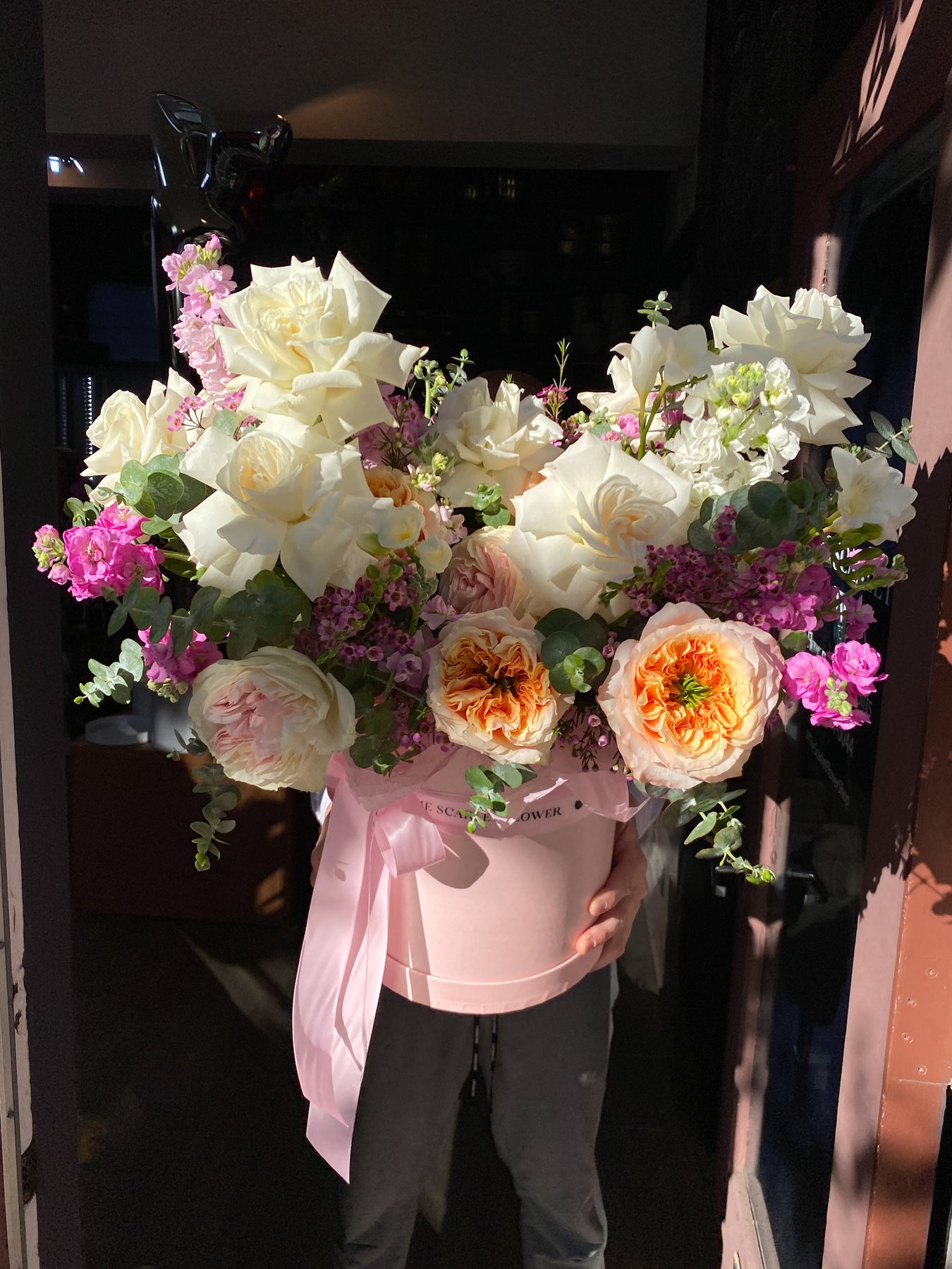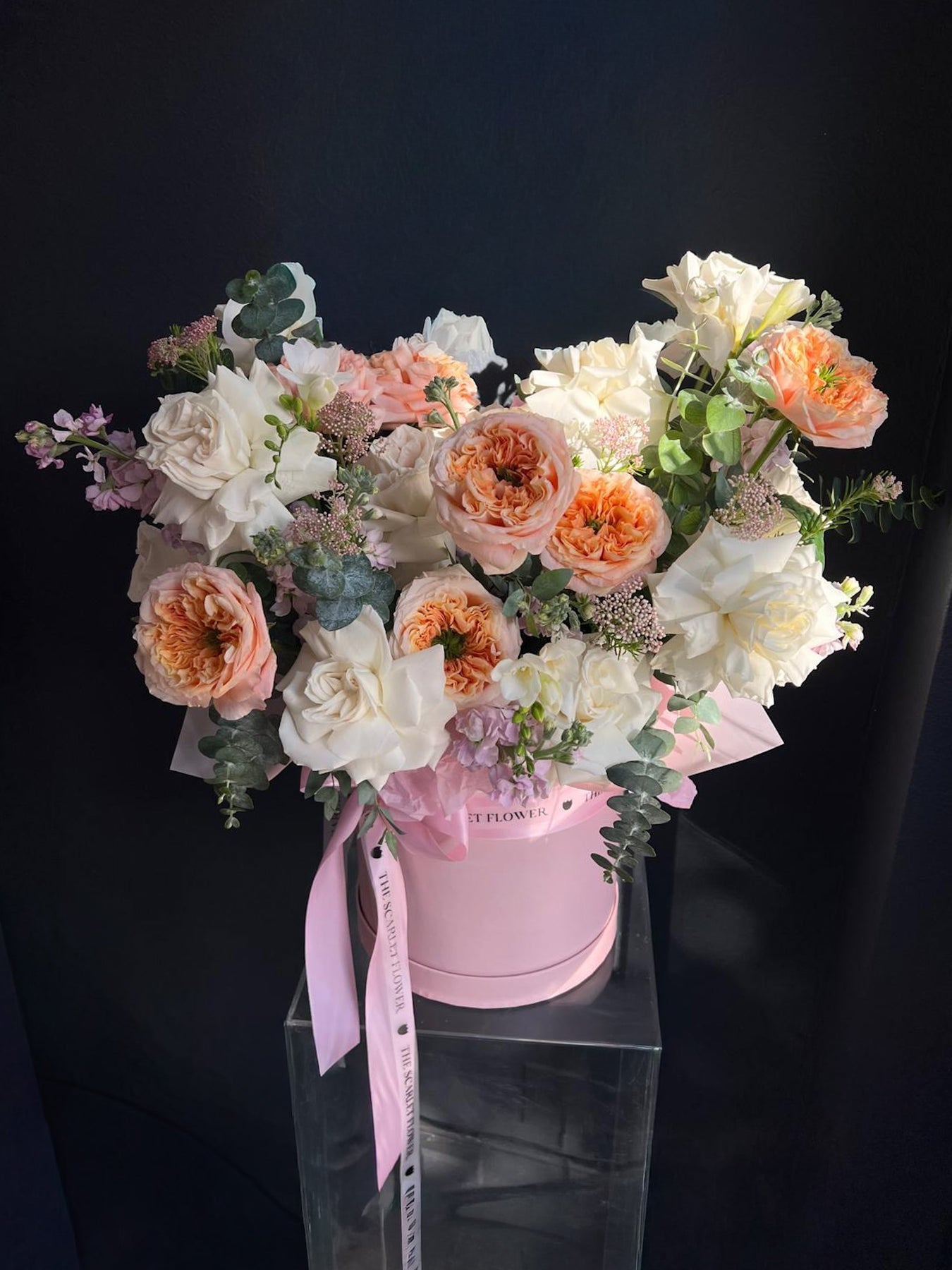 Flower Box - Serenity- garden Roses, stock, eucalyptus