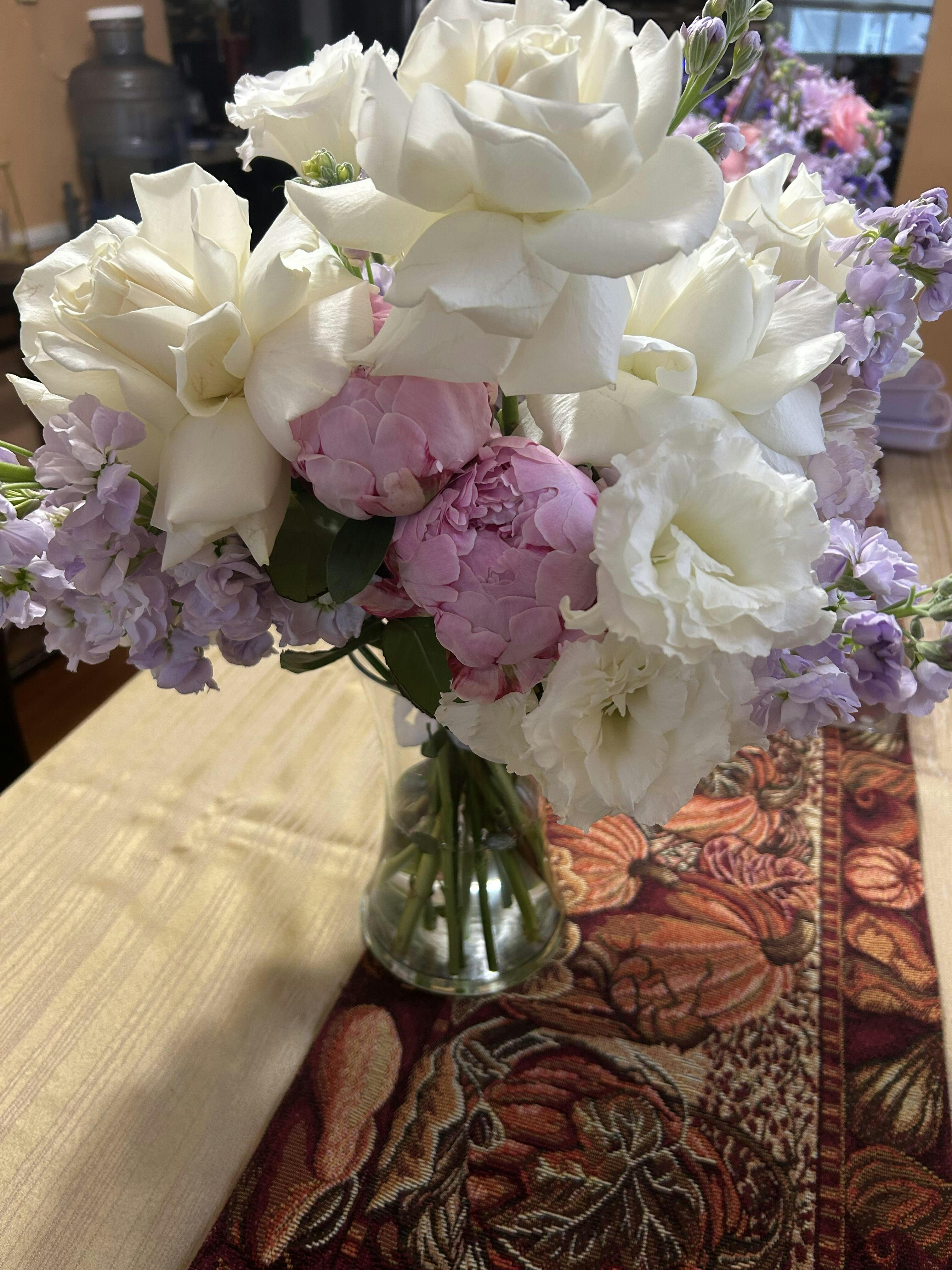 This bouquet blends fragrant lavender stock with white roses, pink peonies, lavender hydrangeas, and delicate white lisianthus. A dreamy mix of textures and pastel tones, perfect for love notes, birthdays, or simply brightening someone’s day.