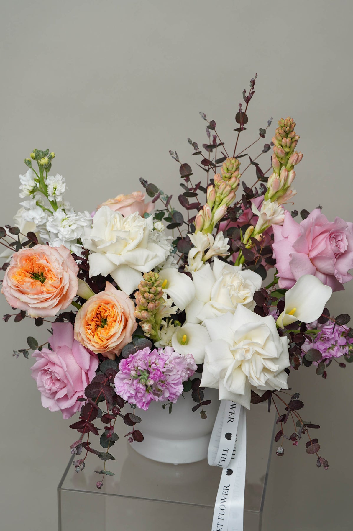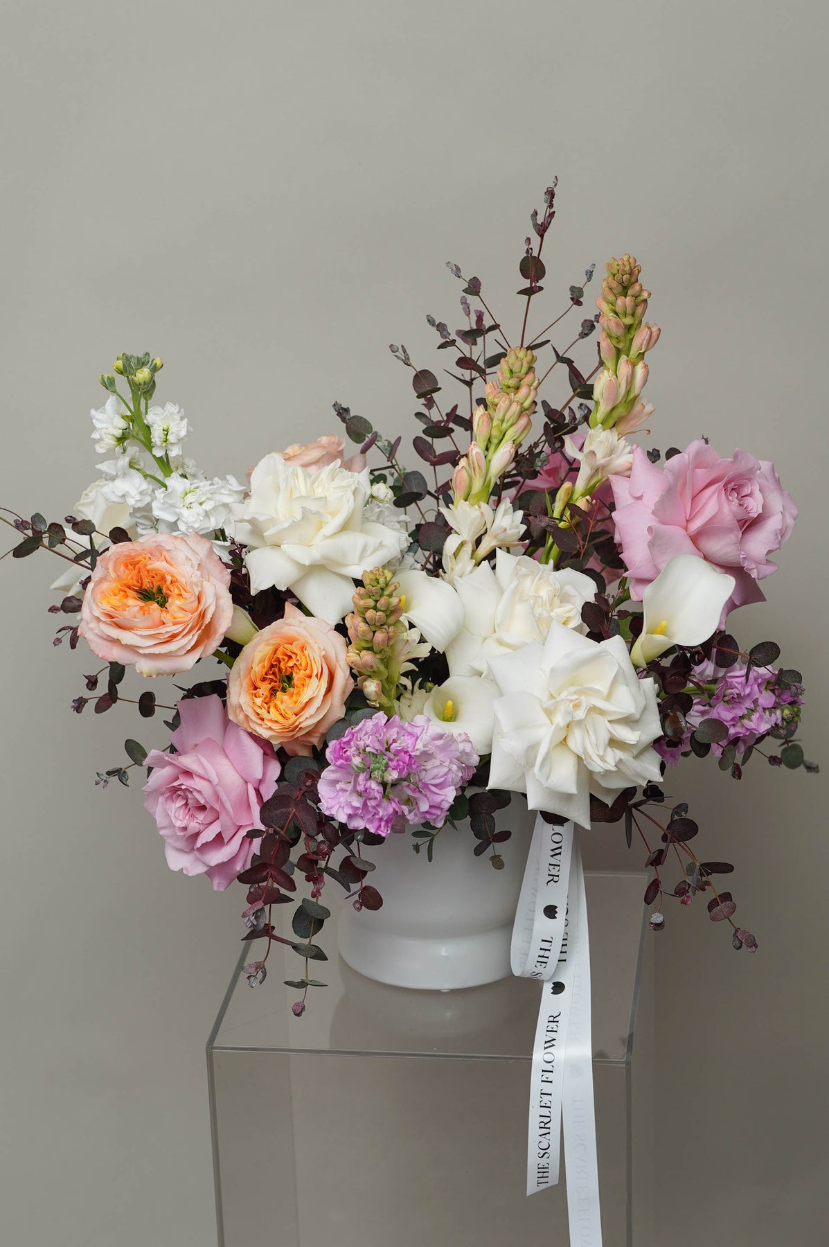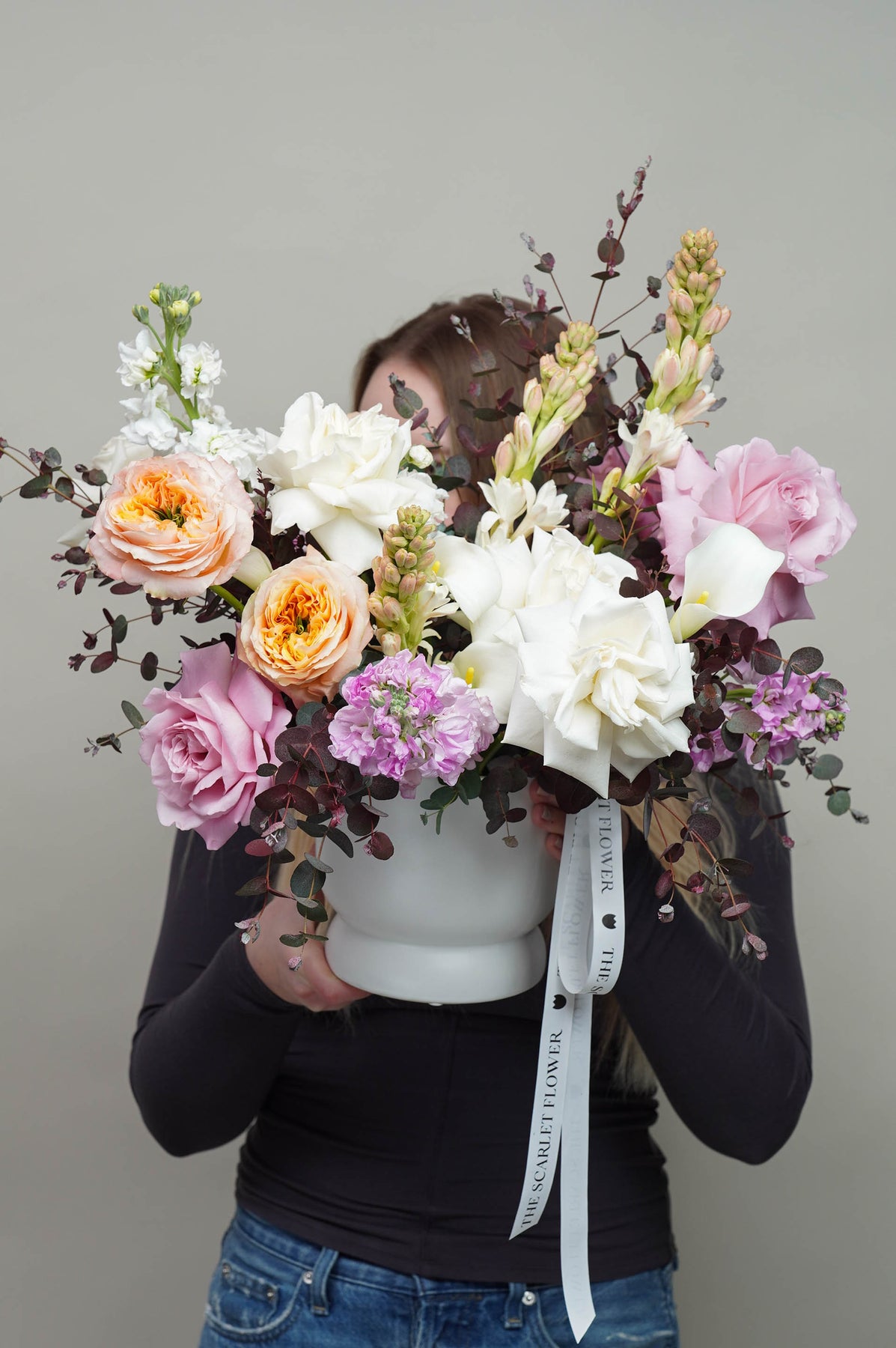 Pastel garden flower arrangement with roses, calla lilies and seasonal blooms in ceramic vase, soft romantic centerpiece for home or gift delivery