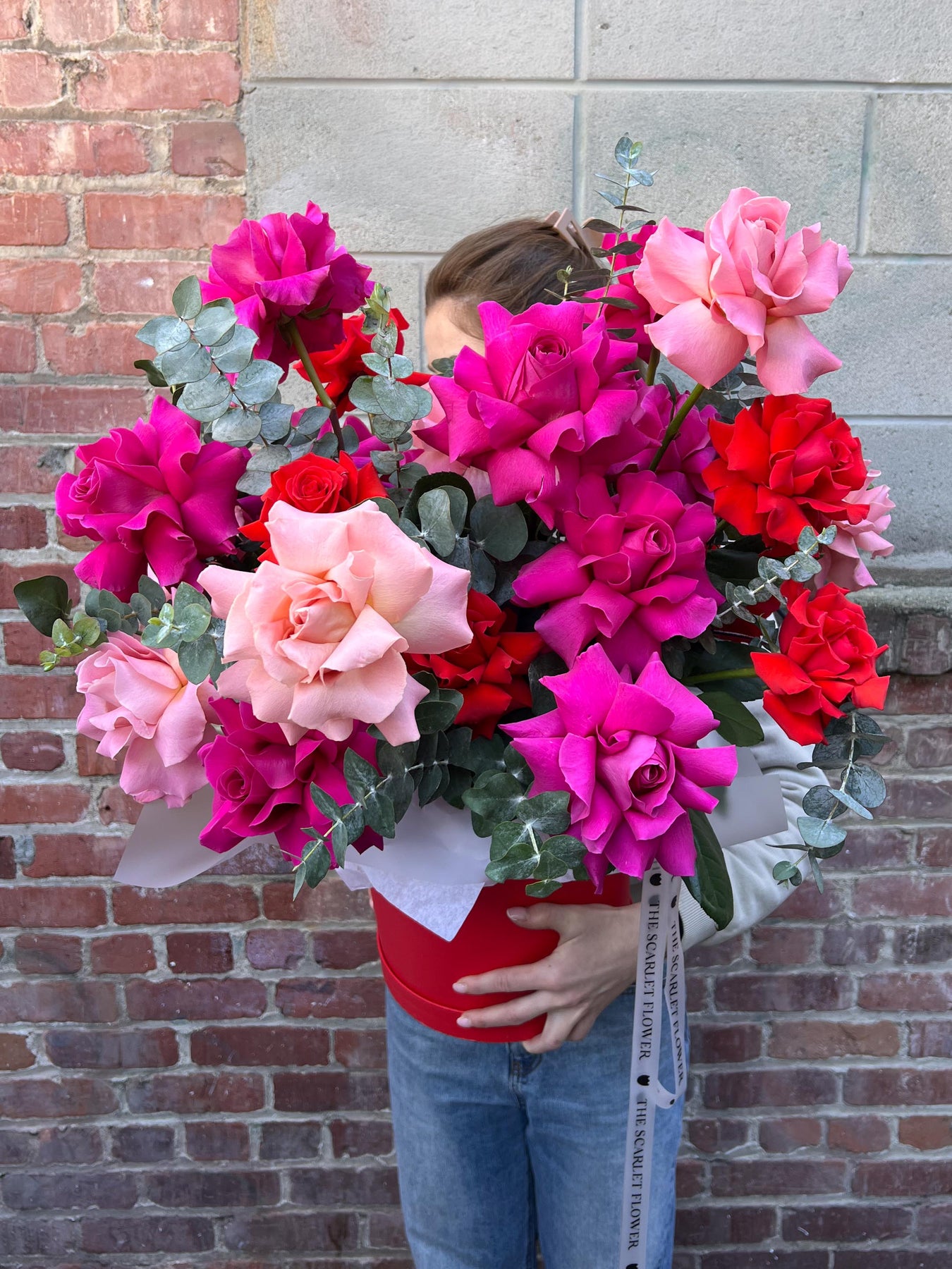 Hot pink, pink and red French reflexed roses with a touch of Our Love, perfect for birthdays, Valentine’s Day, anniversaries, or any special occasion.