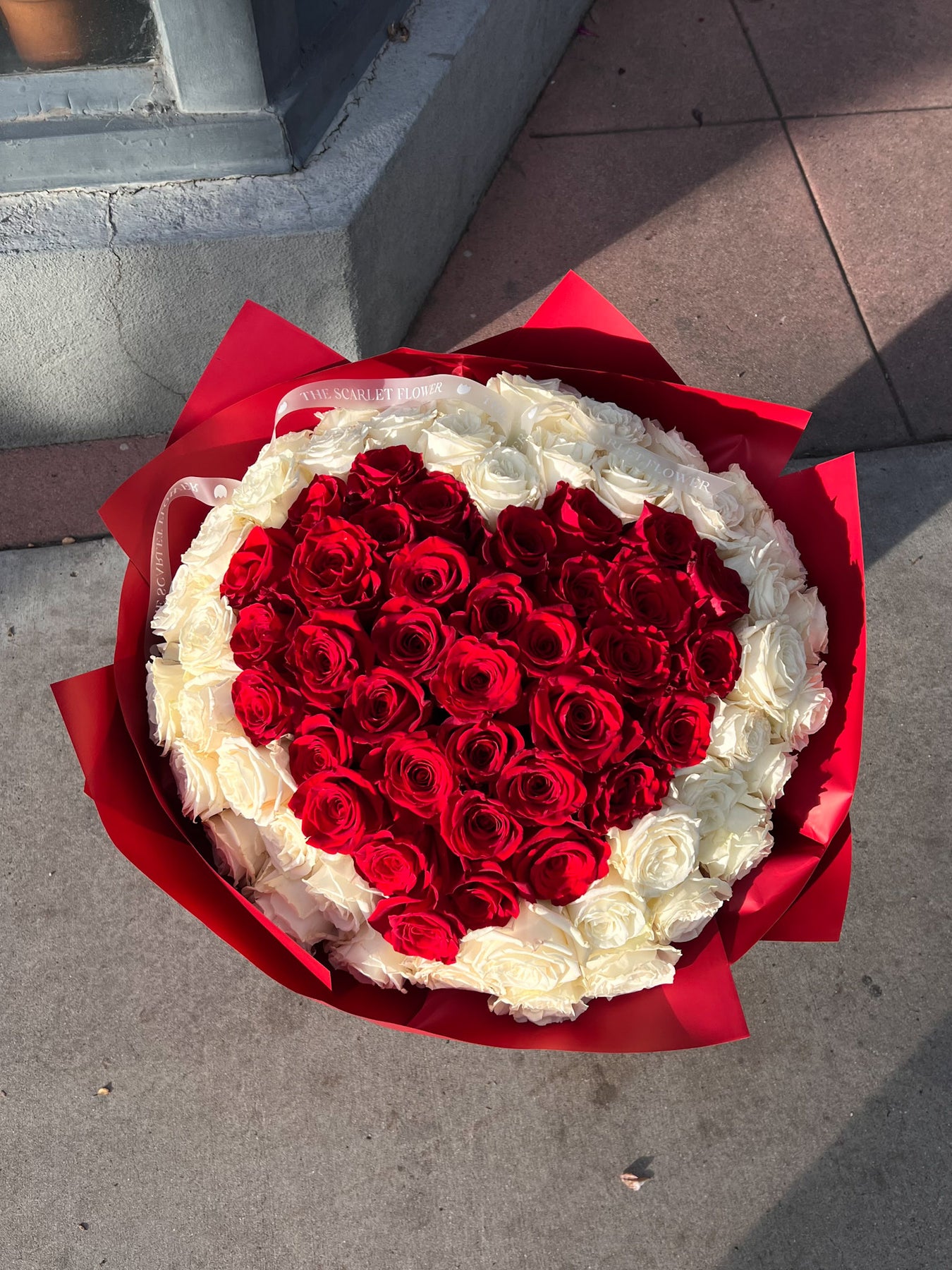 A heart-shaped bouquet of red and white roses.
