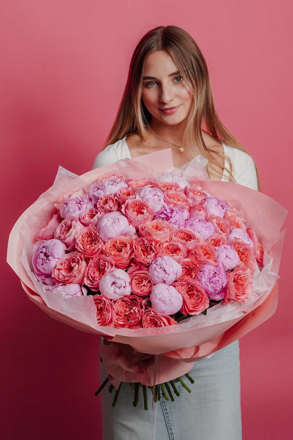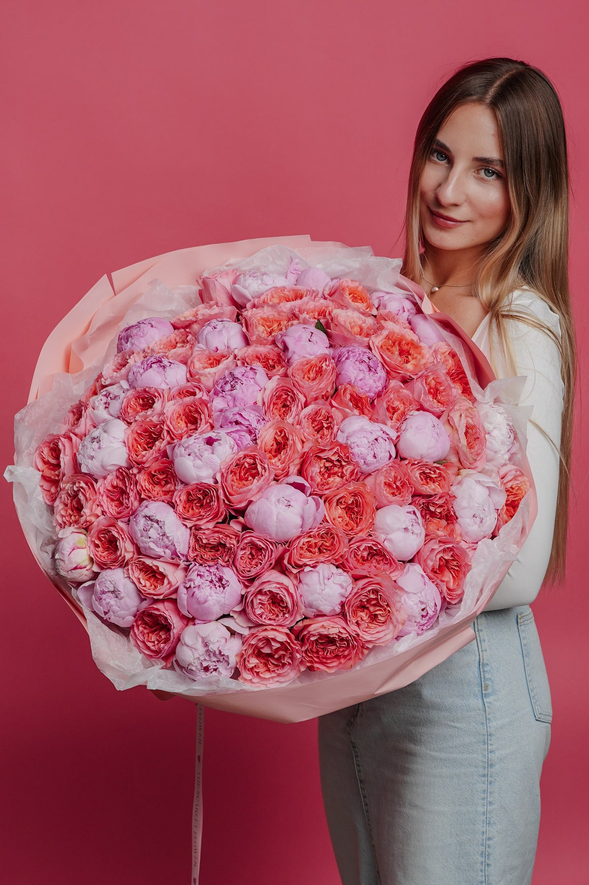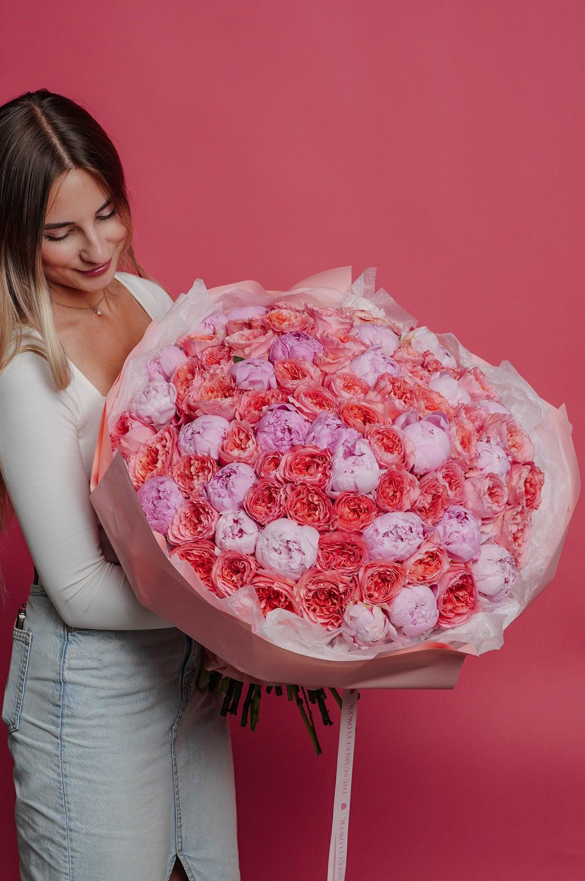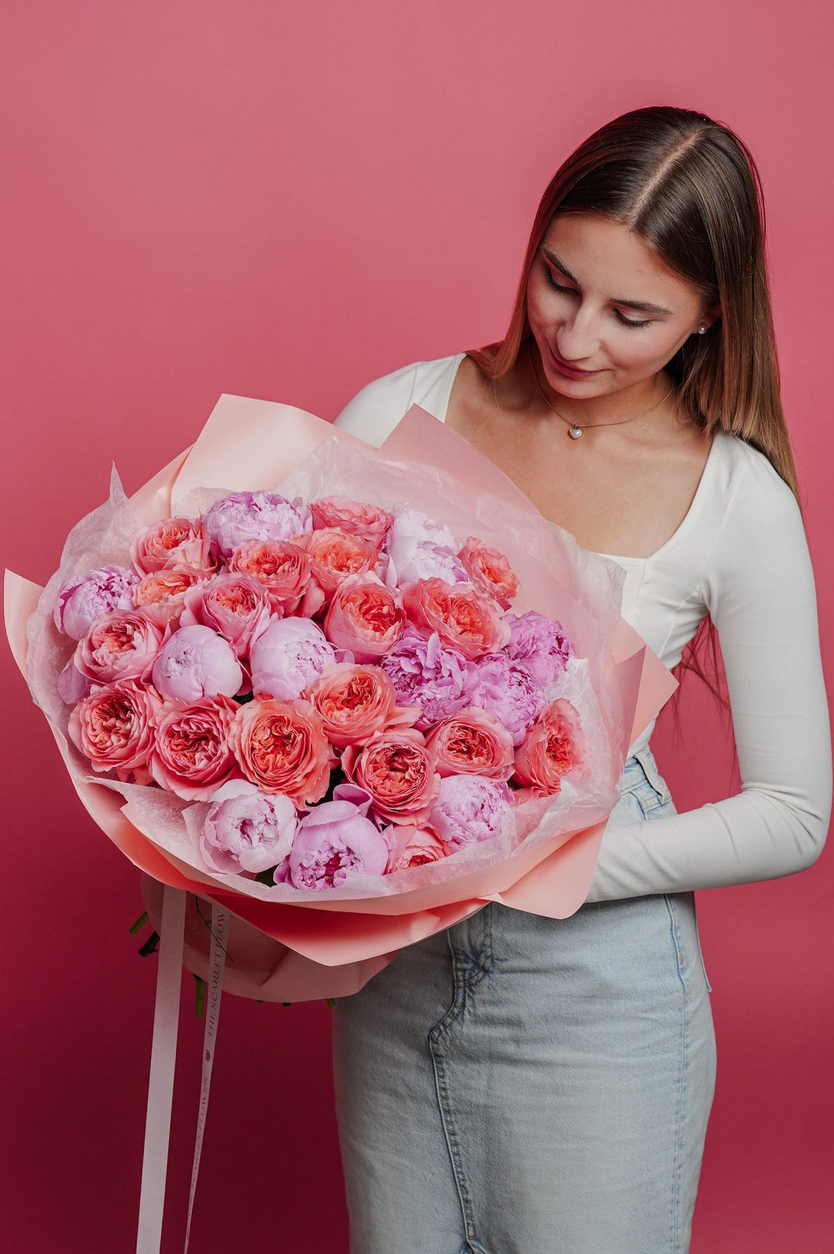Pink Joy - beautiful bouquet pink peonies, pink xpression garden roses