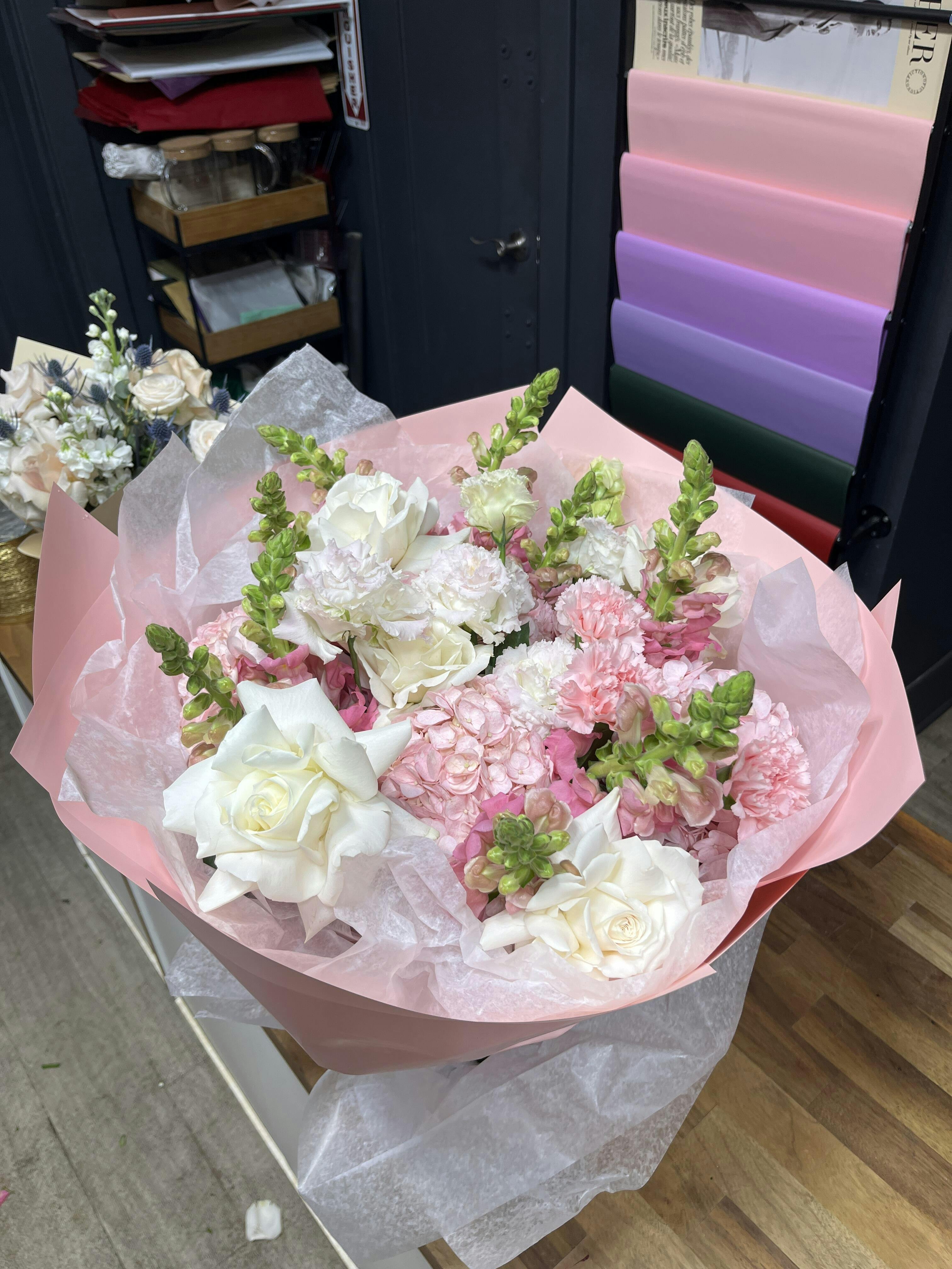 All the Pinks - a bouquet of hydrangeas, snapdragons, lisianthus, and roses
