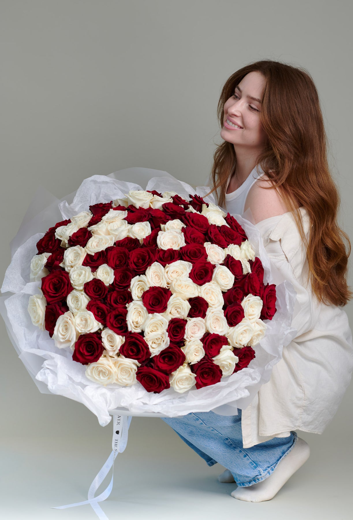 A luxury blend of red Explorer and white Playa Blanca roses, beautifully arranged for any romantic occasion.